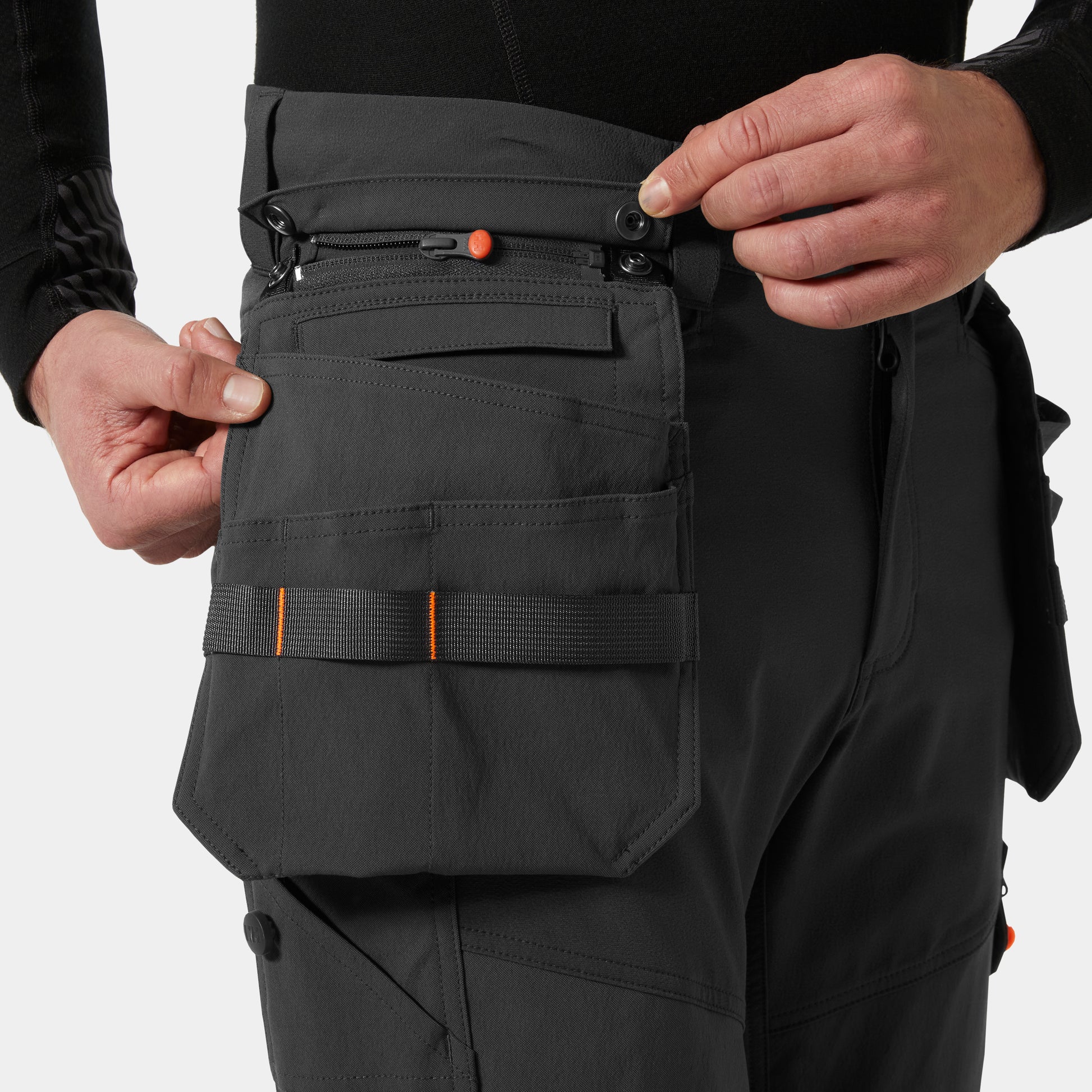Our most rugged offering in the ICU BRZ, the Construction Pant, Class 1 is modern workwear crafted with your needs in mind. Move comfortably through your day in lightweight four-way stretch fabric. A gusseted crotch and articulated knees provide mobility. Reinforced areas include double-lined and webbed hanging pocket bottoms, ruler pocket, and pant-leg hem—all featuring Stretch Cordura® fabric. Customize your fit with adjustable bottom leg snaps and an optional five-cm length increase. Access knee pads from the outside for quicker positioning adjustments. Temperature control elements include zippered side-seam openings and laser-cut ventilation holes at the back. Expert details like zip-off hanging pockets, integrated phone pocket, and a fastening closure on thigh pocket are new workwear staples. The best construction work pants rely on expertise from the field for designs that work as hard as you do.